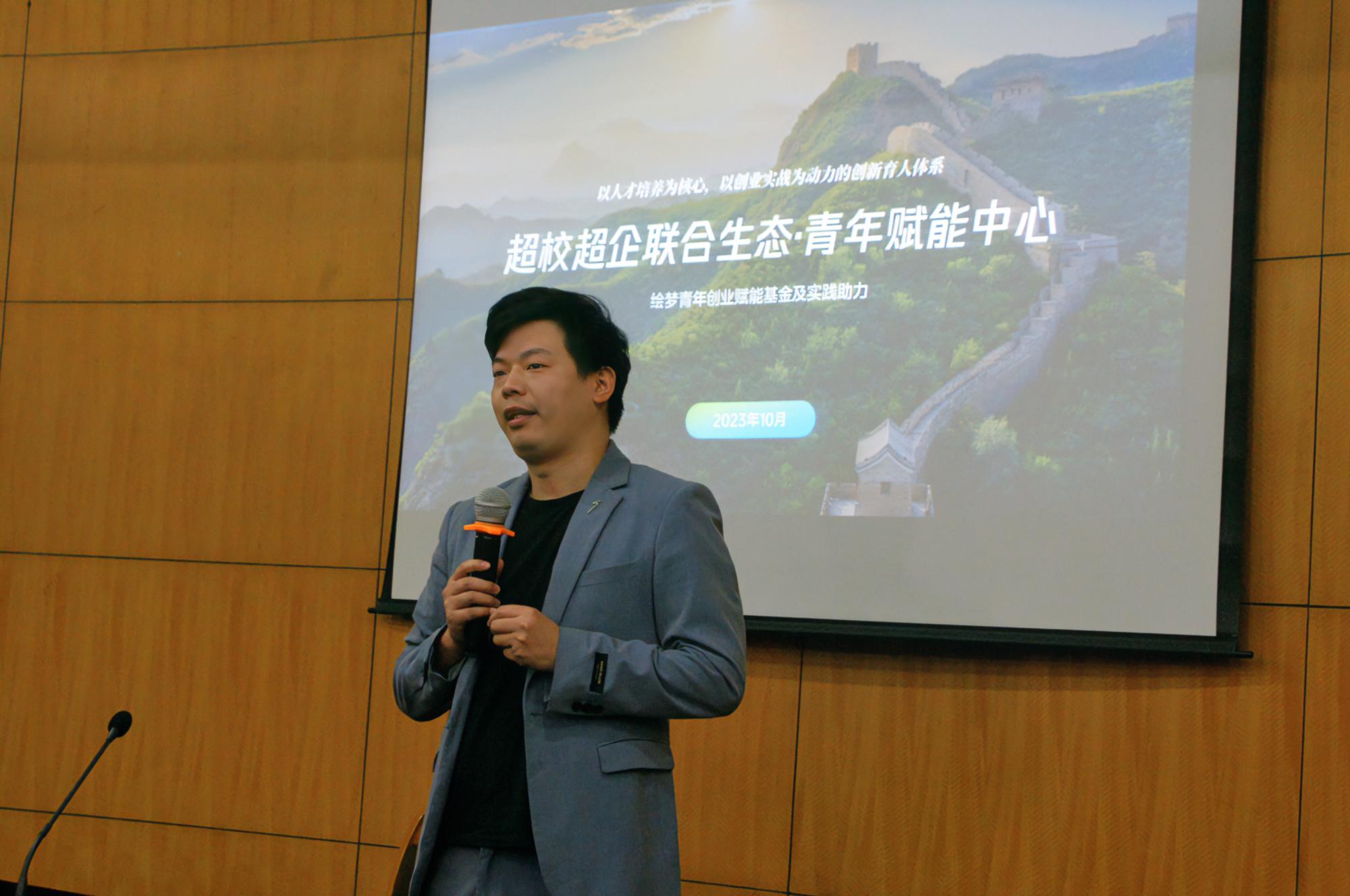 龚茂代表超校联盟致辞,对绘梦工程·青年成长赋能计划做了详细介绍,指明此次新营销创业训练营是面向青年提升的普适性工程,重视对青年创新创业教育的建设,为大学生创新创业提供平台和机会。根据本次训练营的目标,针对赋能方向,实践平台,实践资源和实践基金方面进行了详细介绍。