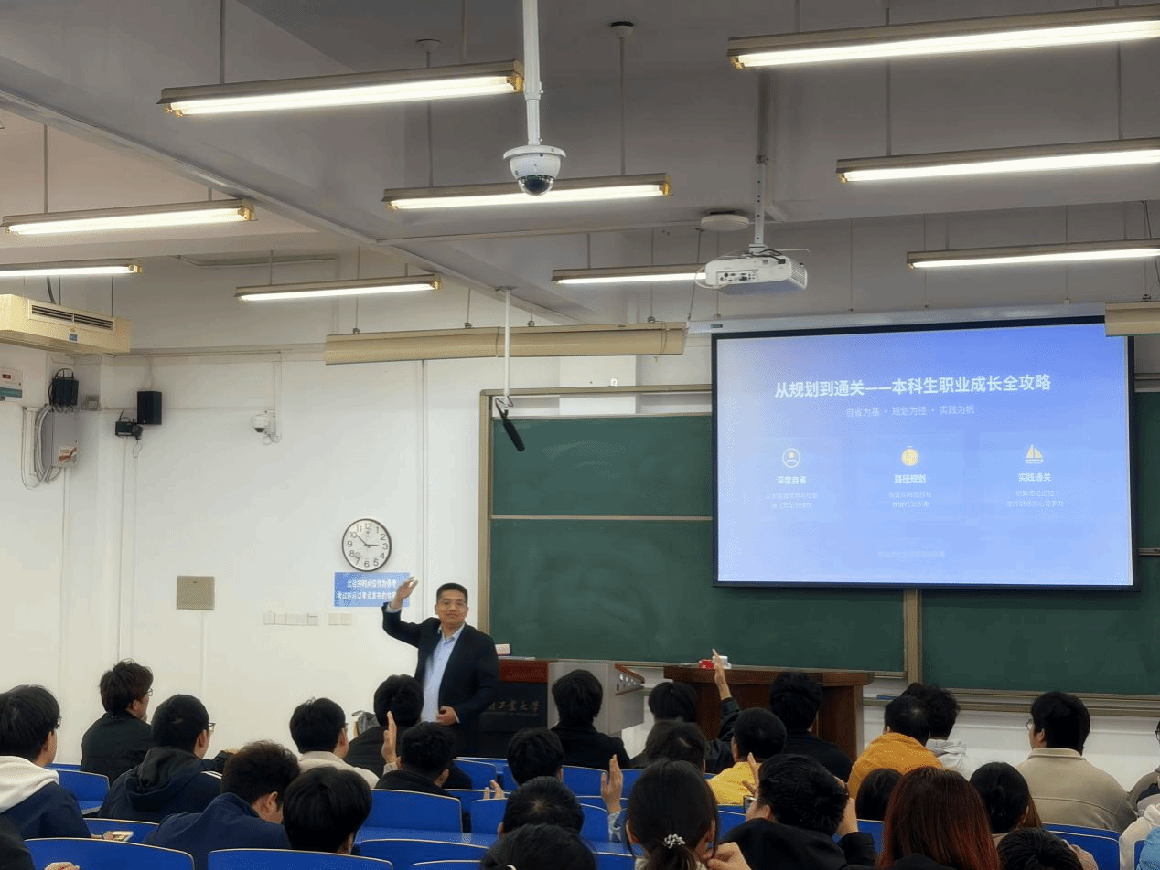 王树立深耕人力资源领域十五年,拥有世界500强、中国500强企业及上市公司招聘经理、人力资源部长、总监等丰富任职经历,同时具备高级人力资源师、二级心理咨询师、职业生涯规划师等专业资质。讲座中,他结合自我认知与职业起步、职业规划与就业准备、求职全流程能力提升、职场避坑与长期成长四大核心模块展开分享,根据自身从业经验与典型案例,为学生拆解了从职业定位到职场发展的全链条逻辑。在自我认知环节,他引导学生通过性格特质、能力优势、兴趣方向等维度梳理自身定位,帮助学生明确职业发展的起点与方向;在求职准备模块,他细致讲解了简历撰写、面试技巧、offer选择等关键内容,针对技术类岗位的招聘特点给出切实有效的建议;在职场发展部分,他提醒同学们要注重职场沟通、情绪管理与持续学习,避免常见职业误区,为长期职业成长筑牢根基。