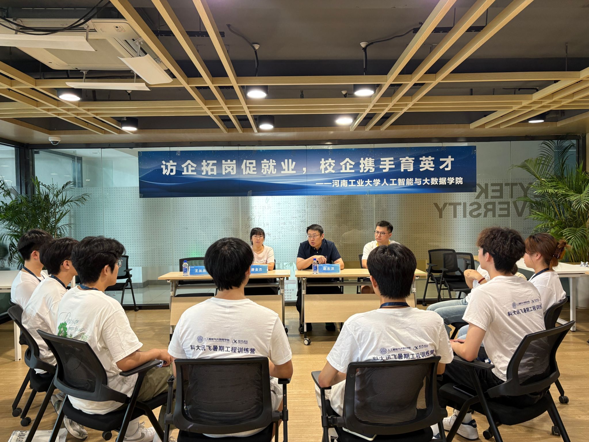 在科大讯飞总部园区,赵志洋一行看望了在此实习的学生。并走进实习学生的工作岗位,近距离了解他们的工作内容、实习进度以及生活情况。今年暑期,我校共有8名学生,以实习生的身份,通过科大讯飞暑期夏令营进入公司实习,在这期间,通过将课堂所学知识与实际工作相结合,同学们提升了专业技能,还培养了沟通协作能力和问题解决能力,对未来的职业发展也更加清晰。