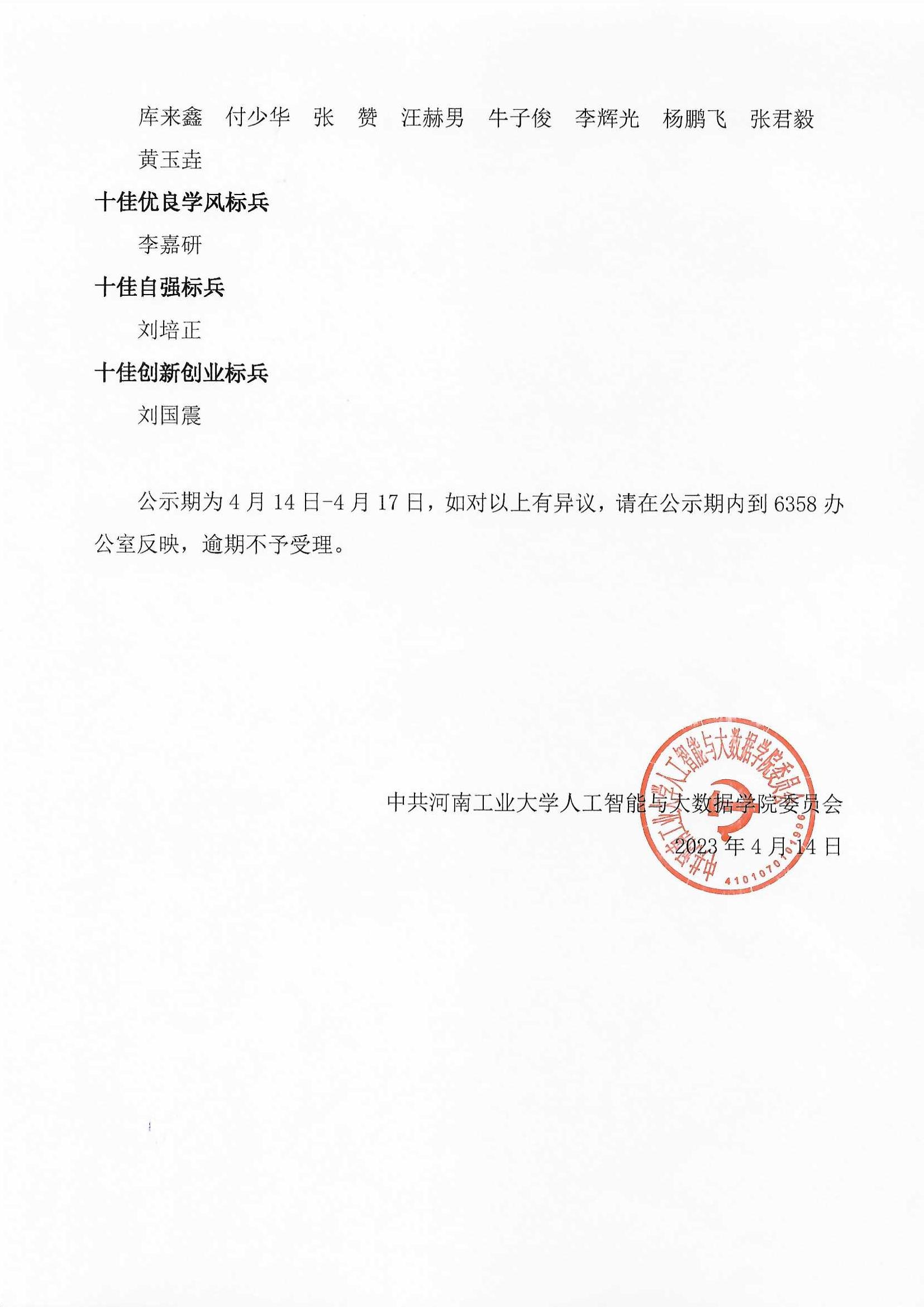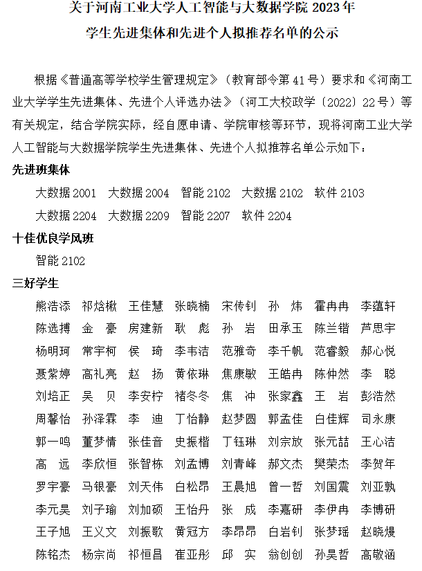 关于河南工业大学90比分网 2023年学生先进集体和先进个人拟推荐名单的公示