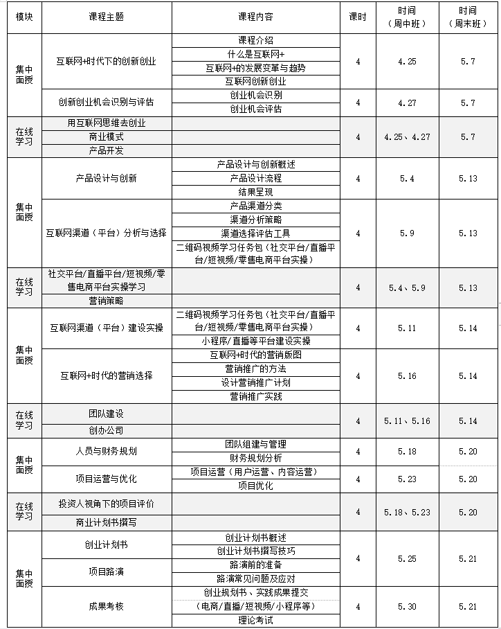 本期课程计划分两类时间段开班,具体安排如下,请根据时间安排选择合适的教学班。教室安排根据招生情况在创业学院网站另行通知。课程实训模块介绍见表1。