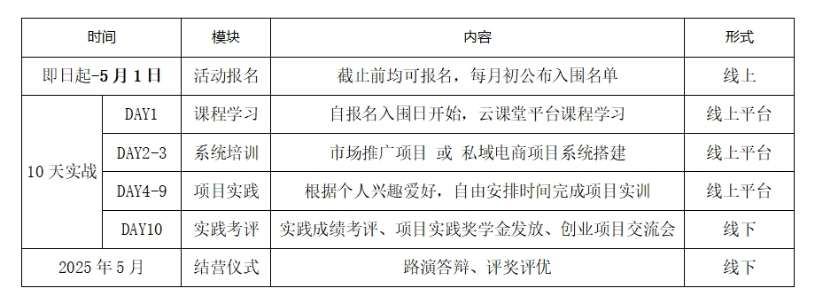 本期训练营将择优选拔优秀创业实践团队,参与项目培训、实战训练等环节,训练营将为学生免费提供“无成本、无风险”的营销推广及创业实践项目,发掘个人创业潜能,深刻探索自己,培养青年创新能力和发现及解决问题的能力,提升自我影响能力、团队协作能力、领导管理能力、增加社会责任感等综合素能,提升未来的就业与创业市场竞争力。