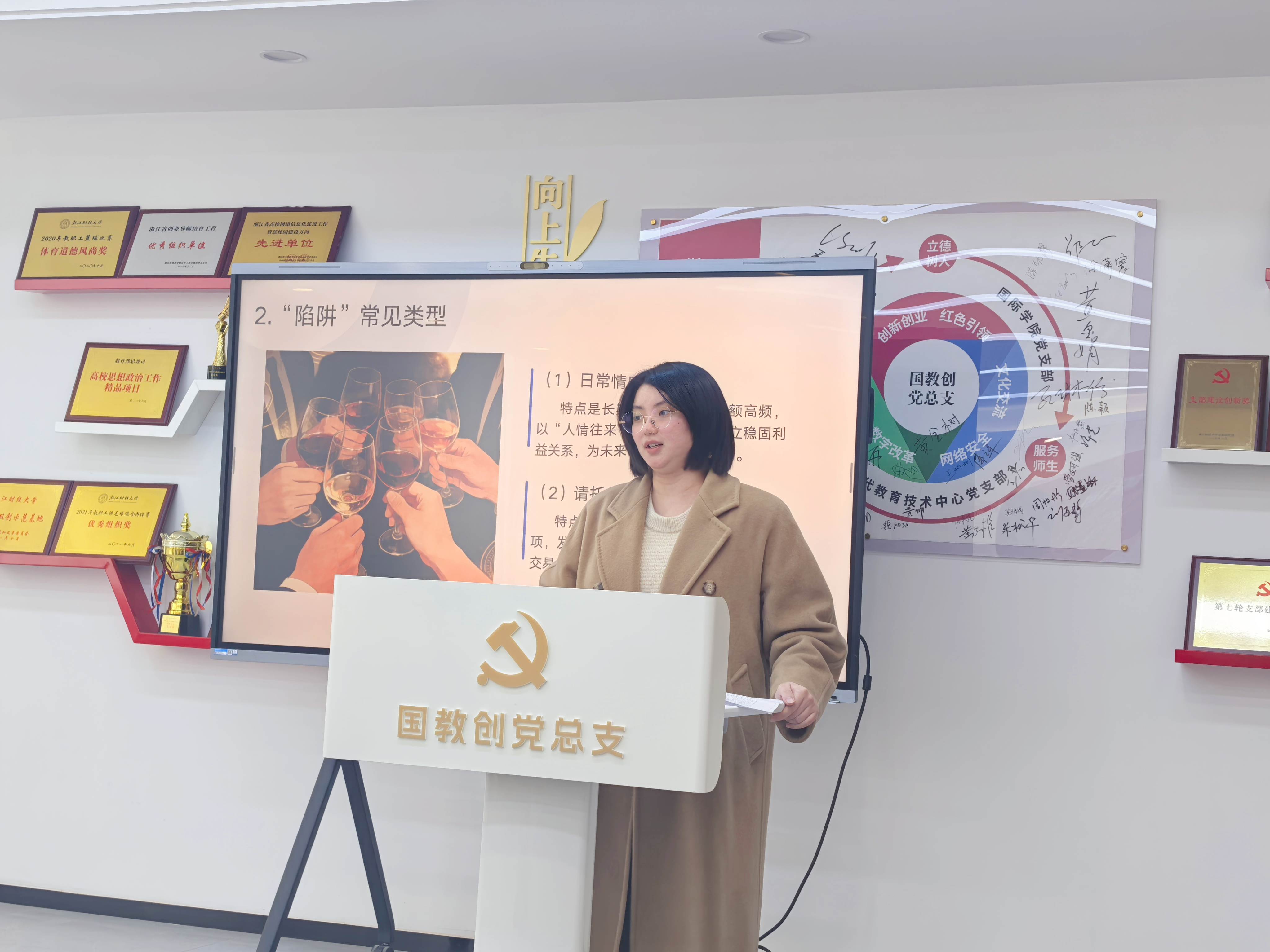 为持续深化党建与业务工作深度融合,筑牢教职工纪律规矩意识,提升行政办公规范化水平与廉洁从业履职能力,12 月 12 日,国教创党总支举办党建、业务工作第四期培训班。本次培训特邀党委办公室、校长办公室党务科科长贺文凯,纪检监察室监督执纪管理干部王亭婷担任主讲嘉宾,党总支书记黄金娟主持活动,各支部党员干部、教职工代表参加培训。
