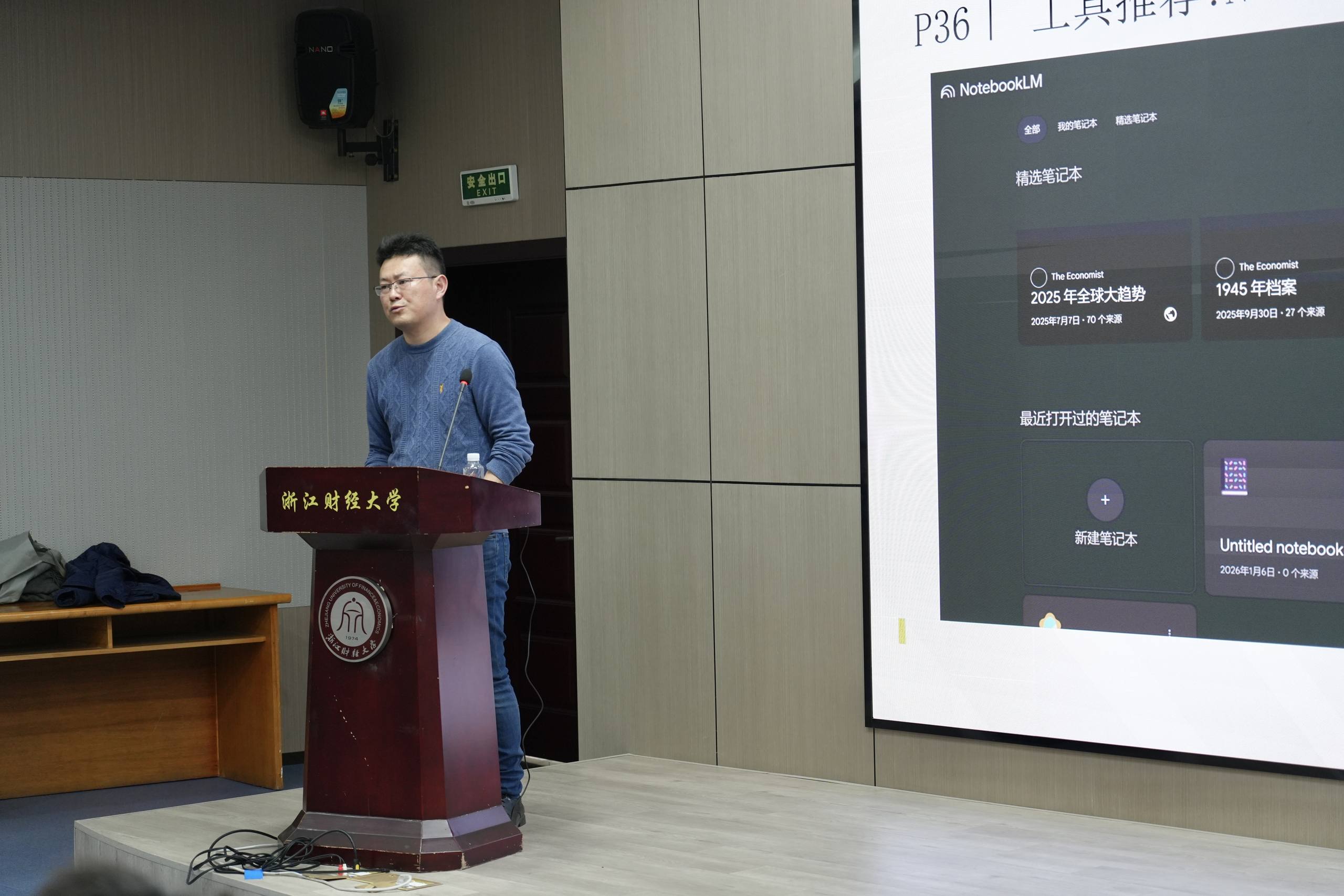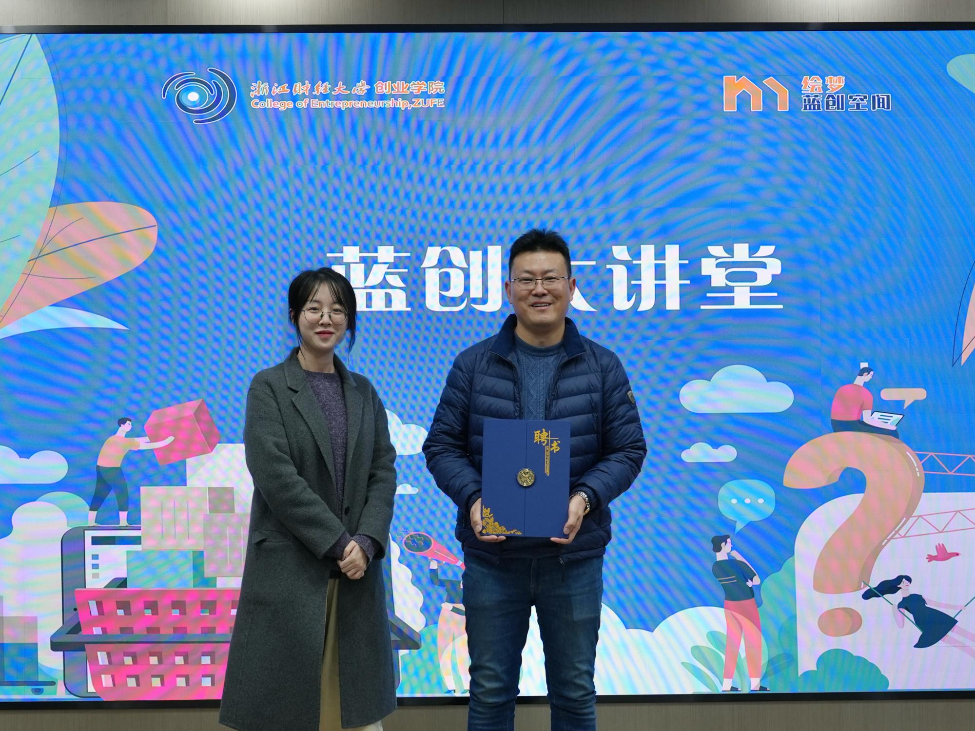 1月6日下午,由浙江财经大学创业学院主办,绘梦蓝创空间承办的第65期蓝创大讲堂在学术中心第三报告厅顺利举行。讲座特邀辰云钧合科技有限公司董事长,人工智能高级训练师、应用工程师艾俊主讲,以“AI时代的生存指南”为主题,为现场师生揭示在人工智能浪潮中构建个人核心竞争力的思维路径与实践方法。讲座开始前,学院特聘艾俊为我校创新创业导师并为其颁发聘书。