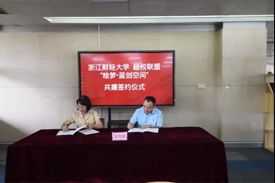 6月6日,超校联盟&浙江财经大学“绘梦·蓝创空间”签约仪式在浙江财经大学文化中心路演厅举行,浙江财经大学创业学院院长尤利群、创业学院副院长沈鑫泉、超校联盟联合创始人兼执行董事刘祖宏、绘梦工场CEO龚茂等出席了本次签约仪式。