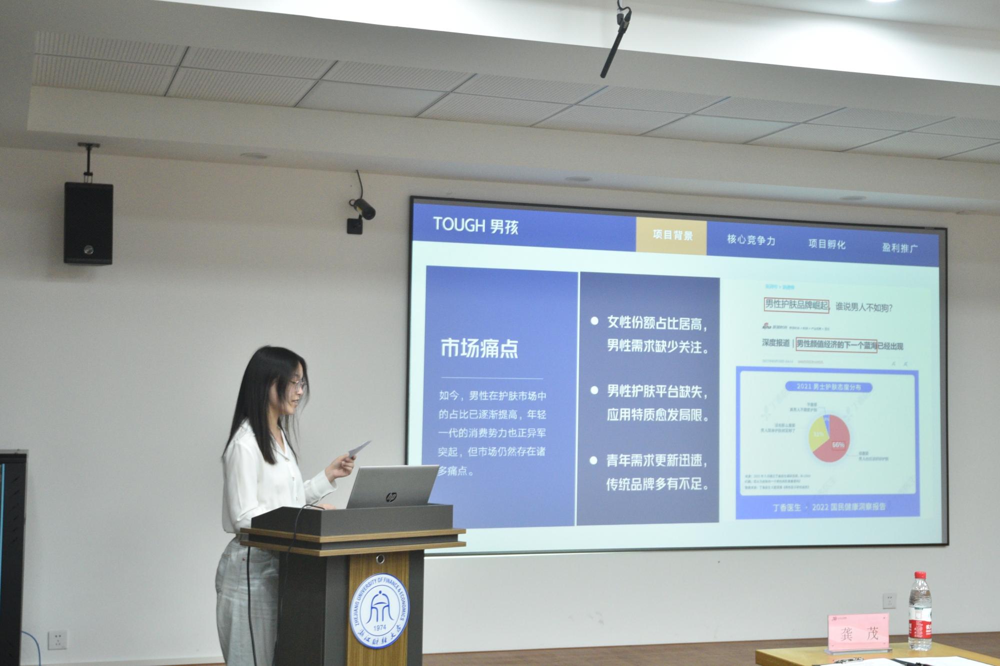 各组创业团队都展现了优秀的路演答辩。其中“Tough男孩”团队通过市场调研,发掘了“男性护肤市场缺失,男性护肤需求缺少关注”的痛点,提出了建立男士测试、护肤、选品一站式平台,并通过专业的检测技术,校企合作等优势策略建立校园护肤平台。“方寸素舍”团队以“年轻,不被定义”的品牌理念,旨在建立新时代寝室软装新品牌。
