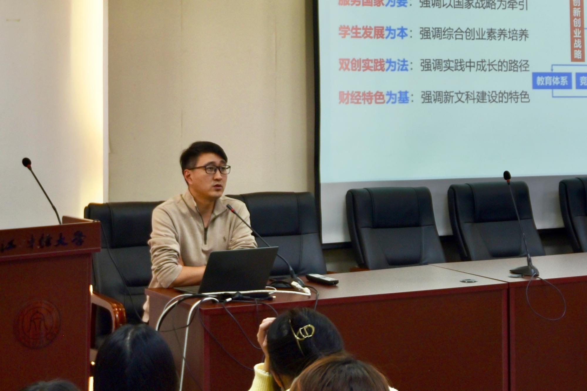 随后,林健林向同学们介绍了我校为响应创新创业教育的总体思路——“1+5+N”模式。此模式深刻剖析了双创教育中的多元形式,以创新创业战略和乡村振兴战略为基础发展双创教育,从教育体系、竞赛体系、实践体系、孵化体系、文化体系五大体系为结构搭建双创教育根基。同时,他指出要以服务国家为要、学生发展为本、双创实践为法、财经特色为基四大条件下实现学生双创素养提升,服务学生成长。