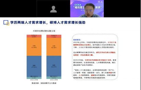 12月13日,由中国职业生涯教育工作者联盟主办、浙江财经大学创业学院承办的CCEA“相约周三·空中云教研”第十九期:人才大数据洞察成功举办。智联招聘华东人才研究院执行院长吕宇龙作为嘉宾对相关数据进行了分析及总结。