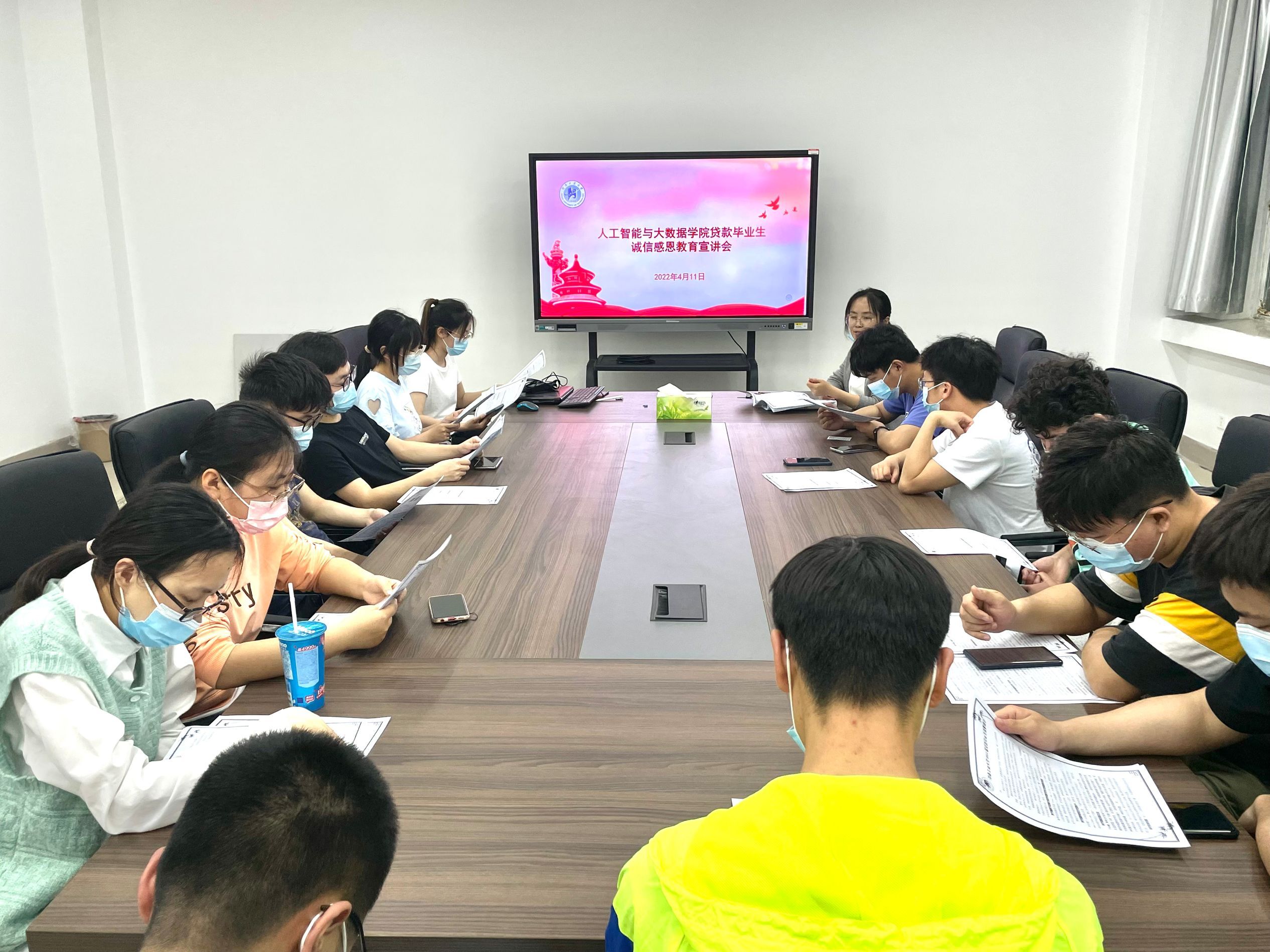 资助工作负责老师齐卫红主持,参与会议的有2018级贷款毕业生、资助助理。