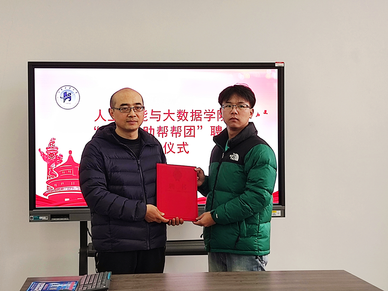 副院长樊超为推免至北京交通大学的张庆澳、推免至西北工业大学的洪瑞阳、获得国家奖学金的侯凯恒、晋级第七届“互联网+”大学生创新创业大赛国赛的郑宇四位“学长导航团”成员,颁发聘书。