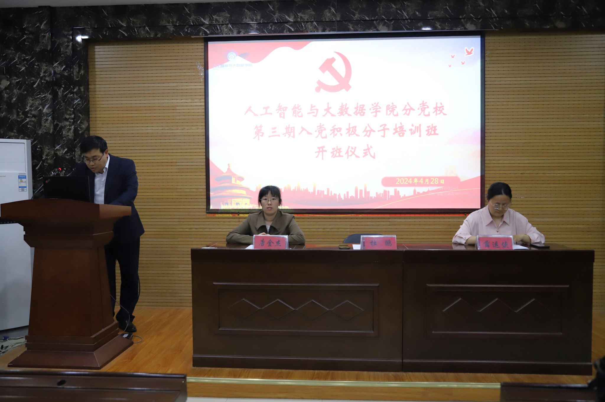 党委书记杜鹏、副书记薛运侠、学生党支部书记代表唐金杰、全体辅导员及本期入党积极分子参加了此次开班典礼。本次典礼由院团委副书记郑帅主持。