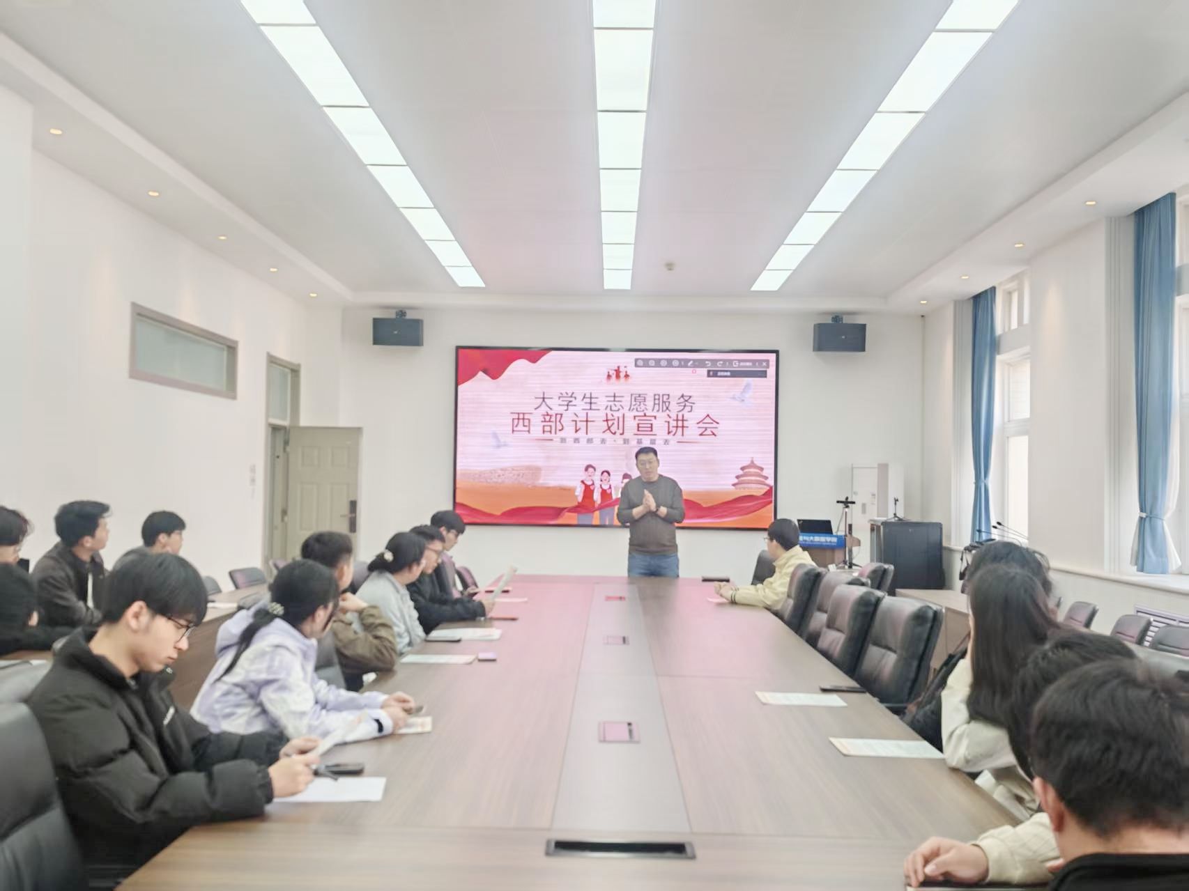 党委副书记赵志洋、毕业班辅导员,以及多名参加西部计划和退役复学的同学,结合国家政策,详细解读西部计划和征兵入伍的细节、报名流程、保障措施等,帮助学生树立正确的就业观念,弘扬以身许国、奋斗报国的精神。