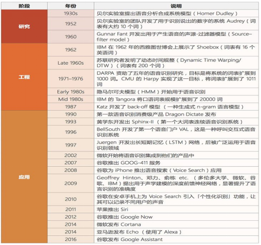 语音识别是指识别语音并将其转换成对应文本的技术。相反的任务即文本转语音也是该领域内一个类似的研究主题。语音识别已经处于应用阶段很长时间了。最近几年,随着大数据和深度学习技术的发展,语音识别进展颇丰,现在已经非常接近社会影响阶段了。下图为语音识别领域的发展历程。